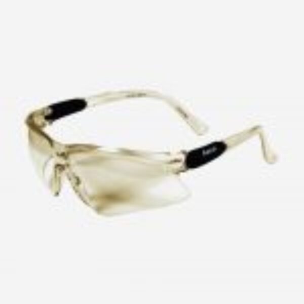 Óculos de segurança, constituídos de armação e visor curvo confeccionados em uma única peça de policarbonato incolor, com revestimento externo de filme espelhado ou cinza(escuro), com ponte e apoio nasal injetados do mesmo material e hastes tipo espátula.