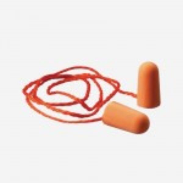 Protetor auditivo tipo inserção moldável de espuma de poliuretano no formato cilíndrico com cordão de poliéster.