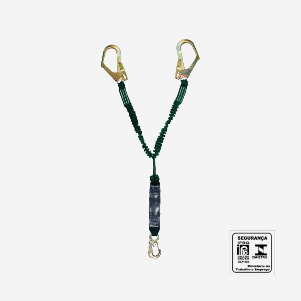 Talabarte duplo com absorvedor de energia, confeccionado em fita de poliéster tubular com elástico interno.