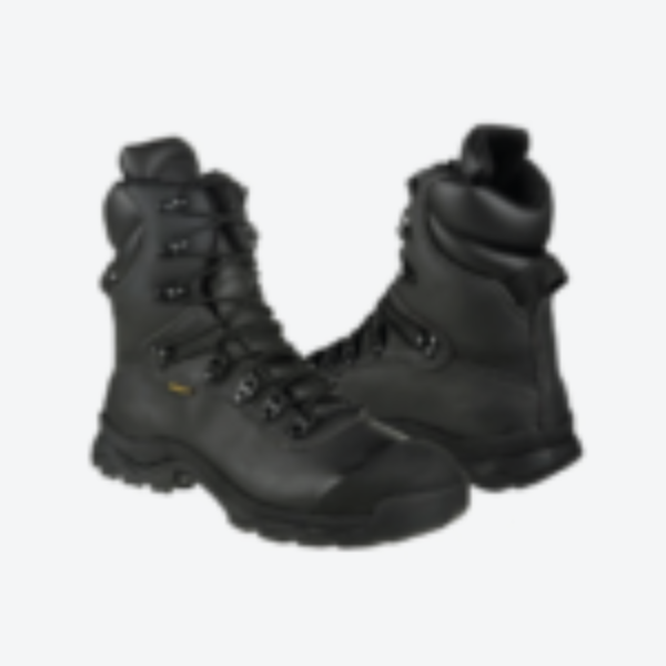 Calçado ocupacional, tipo bota, com sobrebiqueira polimérica, palmilha de montagem em manta e polímero inejtado antiperfuro, forrado com membrana impermeável e respirável, fechamento através de atacadores, com palmilha interna e sola à base de borracha.