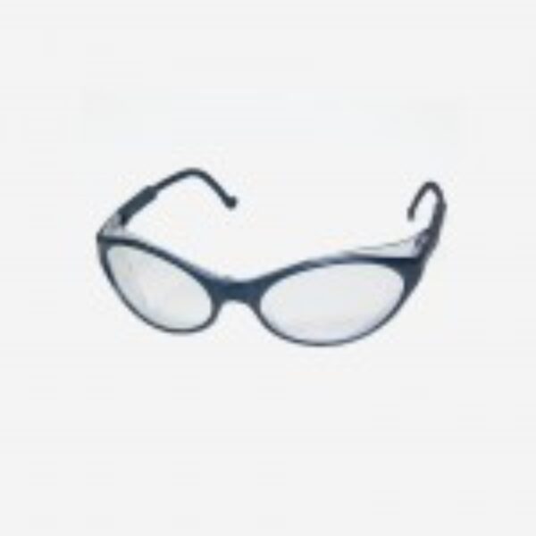 Óculos de segurança, modelo convencional, com armação de material plástico preto ou azul, hastes tipo espátula, confeccionadas do mesmo material da armação e constituídas de duas peças: uma semi-haste vazada com uma das extremidades fixada à armação por meio de rebite metálico e outra semi-haste que se encaixa na outra extremidade da semi-haste anterior e que possui um pino que permite regulagem de tamanho.